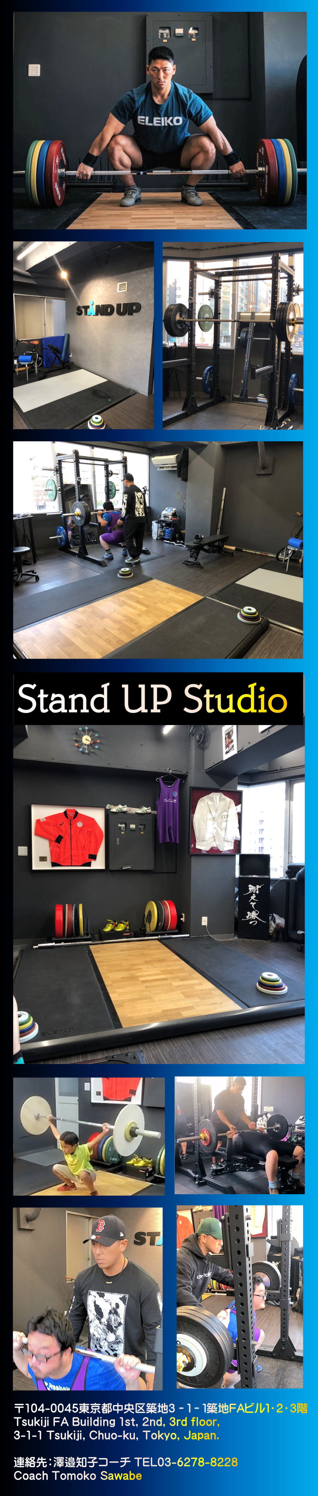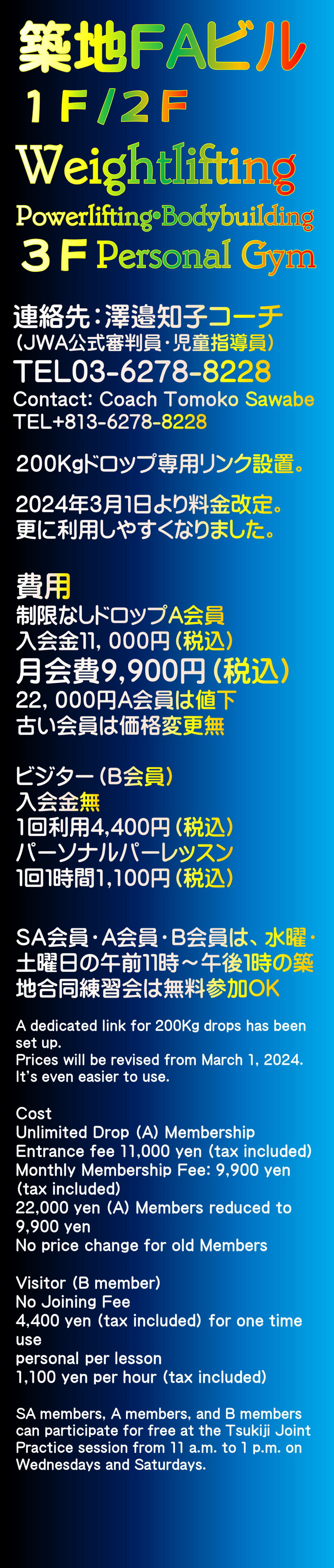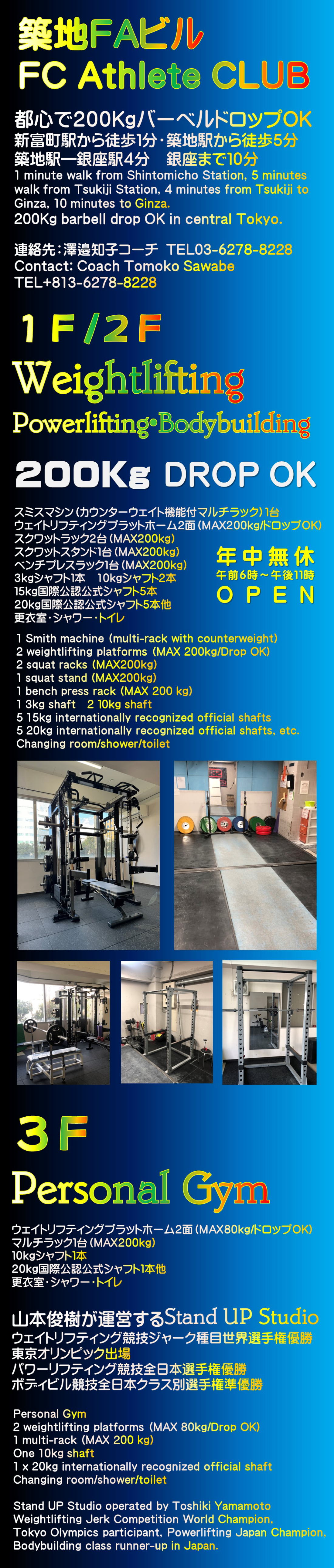 FCアスリートクラブ~築地ジム1階・2階はクロスフィット築地CrossFit Tsujii 200kgDropウェイトリフティング練習場。3階はStand Up Studioパーソナルジム。千葉九十九里は会員専用別荘・トレーニング施設。